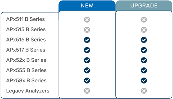 Bluetooth 5 APx 模塊可在新分析儀中配備,也可作為對現(xiàn)有 B 系列分析儀的升級選項。APx516B、APx517B、APx52xB、APx58xB 和 APx555B 分析儀均可配備此模塊,參考下圖。